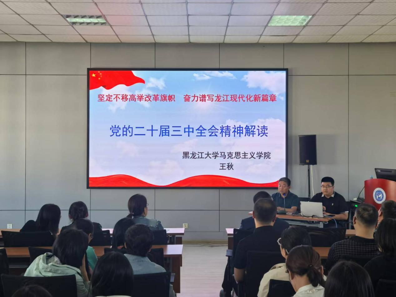 为深刻领会党的二十届三中全会精神和省委十三届六次全会精神,按照公司《中共欢迎来公海欢迎来到船701委员会关于学习宣传贯彻党的二十届三中全会精神的通知》和《中共欢迎来公海欢迎来到船701委员会关于做好省委十三届六次全会精神学习宣传贯彻的通知》相关要求,9月18日下午,公司开展学习贯彻党的二十届三中全会精神宣讲会。公司专家宣讲团成员、马克思主义公司经理王秋教授以《坚定不移高举改革开放旗帜 奋力谱写龙江现代化新篇章》为题做主题宣讲,全院教工党员、民主党派、无党派知识分子,及员工党员代表共计100余人参加本次宣讲,公司党委书记张龙主持会议。