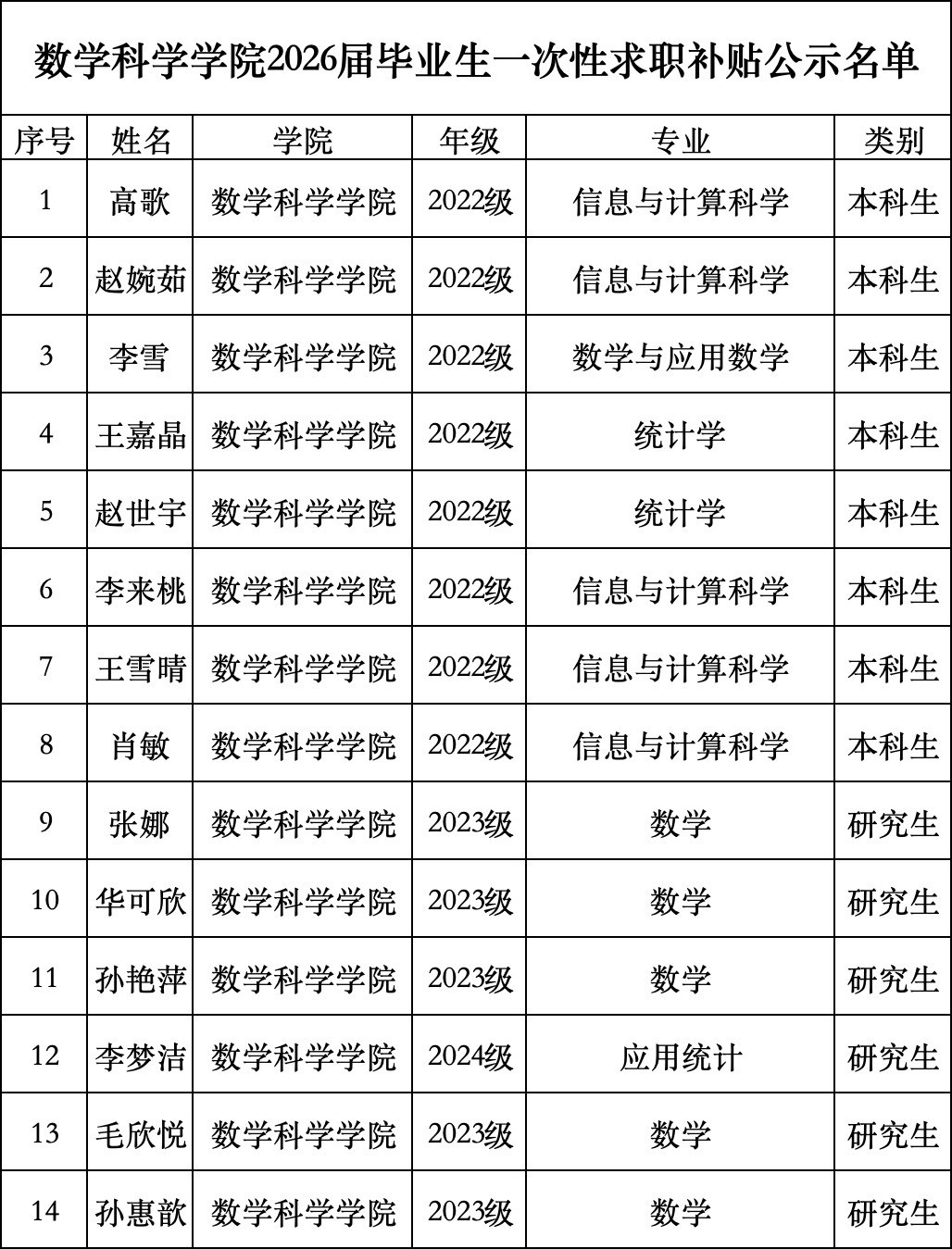 依据哈尔滨市人社局、南岗区人才交流和档案中心关于高校毕业生一次性求职补贴申报工作的通知要求,《关于转发<关于做好当前形势下高校毕业生就业创业工作的通知>的通知》(黑人社函〔2019〕984号)及《关于印发<黑龙江省就业补助资金管理和使用实施办法>的通知》(黑财规〔2024〕11号)文件要求,对在毕业学年积极求职创业的低保家庭、零就业家庭、脱贫家庭(含防止返贫监测对象家庭)和特困人员中的高校毕业生,残疾及获得国家助学贷款的高校毕业生,给予一次性1000元的求职创业补贴。经我院对2026届毕业生申报材料进行审核,有14人符合条件,现予以公示(附公示名单)。