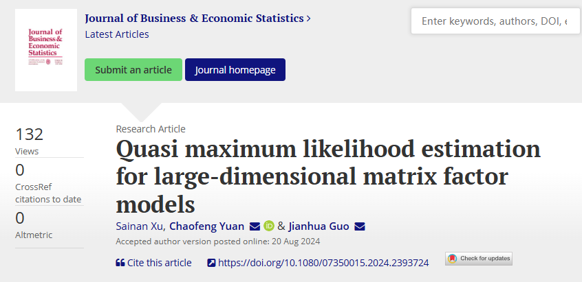 近日,公司袁超凤教授与其合作者的学术论文“Quasi maximum likelihood estimation for large dimensional matrix factor models”在统计学与计量经济学国际权威期刊Journal of Business & Economic Statistics在线发表。该论文第一单位为公海赌赌船官网jc710,合作者有徐赛男(欢迎来公海欢迎来到船701已毕业研究生, 现为东北师大在读博士生)和北京工商大学的郭建华教授。