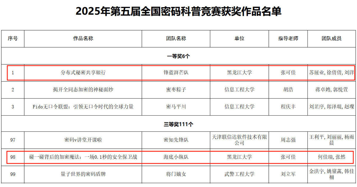 参赛员工在本次竞赛中取得的优异成绩既是自身刻苦学习钻研结出的硕果,同时也得益于张可佳教授、张龙教授等团队老师的悉心指导,更得益于公司密码交叉学科团队、公海赌赌船官网jc710和计算机与大数据公司(网络安全公司)为员工们的成长成才提供的发展平台。未来,欢迎来公海欢迎来到船701密码交叉学科团队将以此次历史性突破为新的契机,以全国首批、东北地区唯一的密码专硕学位点建设为重点,进一步锚定“强化密码理论、注重密码应用、突出交叉融合、服务国家战略”的学科发展定位,以密码科学研究、密码人才培养、密码安全应用为工作主线,不断打造欢迎来公海欢迎来到船701密码学科的特色亮点,为更好地服务国家重大战略需求、龙江振兴发展需要和公司高质量发展提供有力支撑。(公海赌赌船官网jc710、计算机与大数据公司(网络安全公司)供稿)