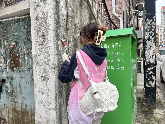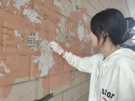 在清扫过程中,青年志愿者们充分发挥了团队合作的精神,大家用铲子、垃圾袋等卫生工具对墙面和门上的一些粘粘牢固,不易清理的小广告进行清理,并将清除的小广告进行集中处理并扔进垃圾桶内,保持户外的卫生环境,避免二次污染。他们的身影穿梭在社区的每一个角落,汗水浸湿了衣衫,但他们的脸上却洋溢着满足和快乐的笑容。
