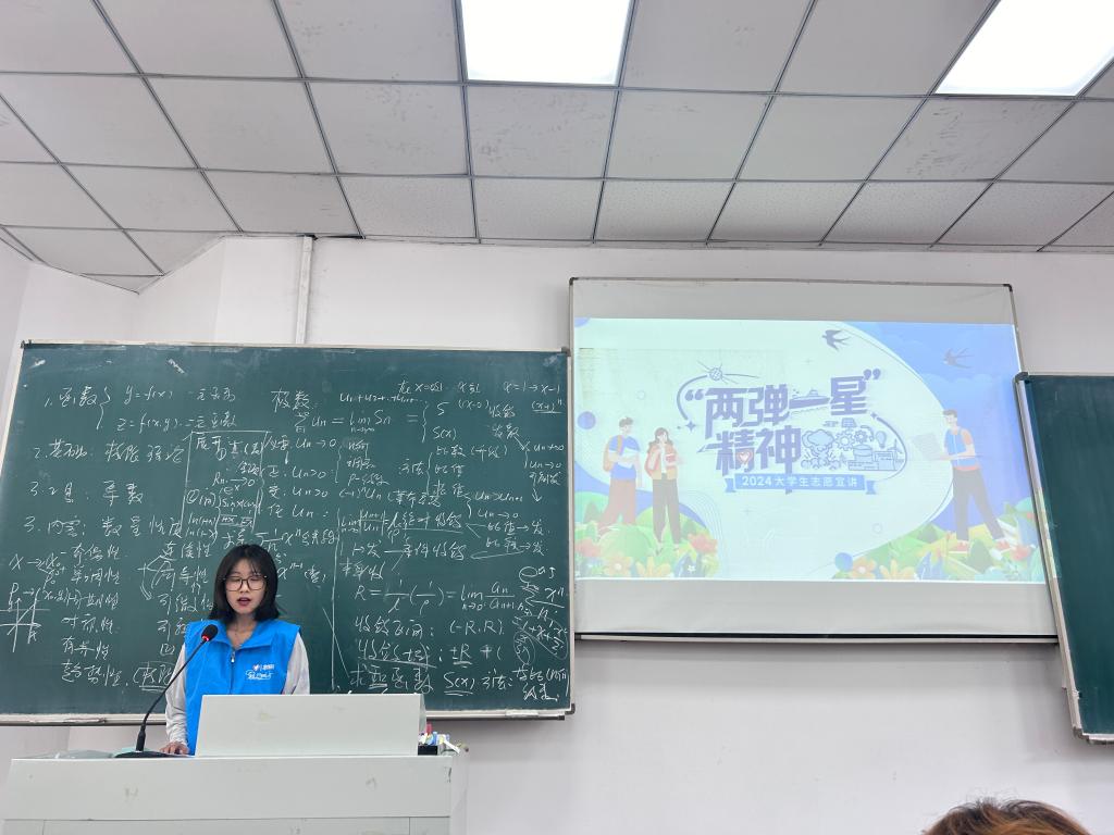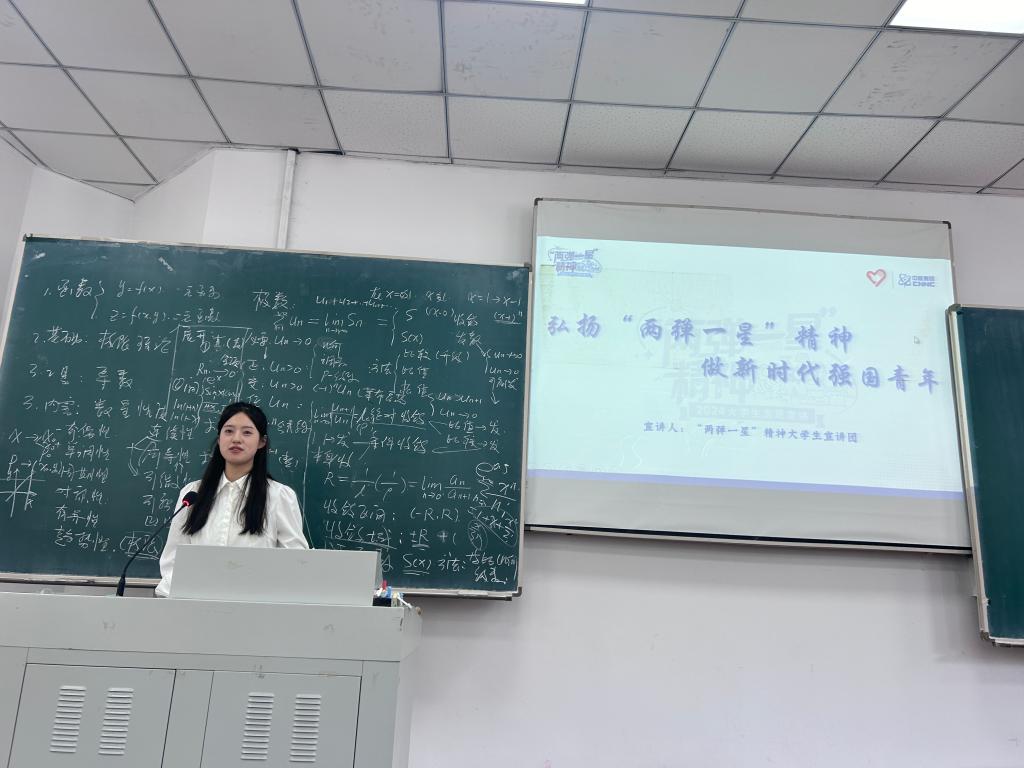 秦雪莹同学带领同学们了解我国两弹研发的背景,深入理解“两弹一星”精神的内涵,呼吁同学们弘扬“两弹一星”精神,勇担时代重任,争做新时代强国青年。