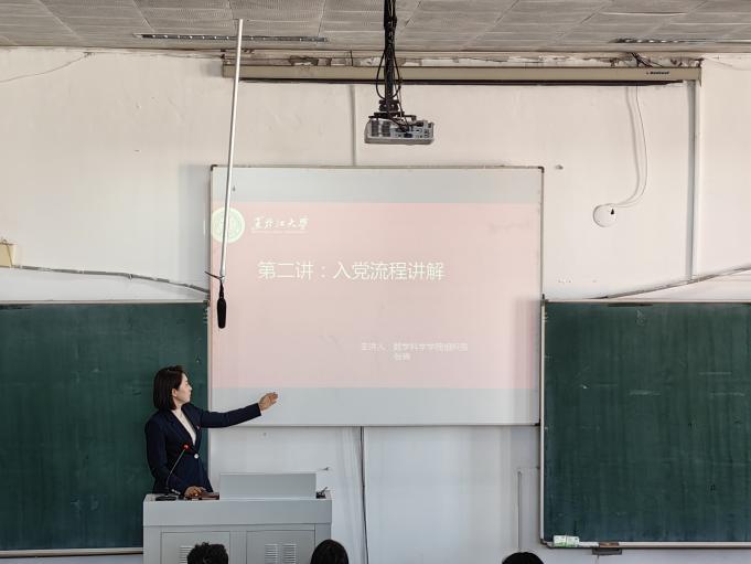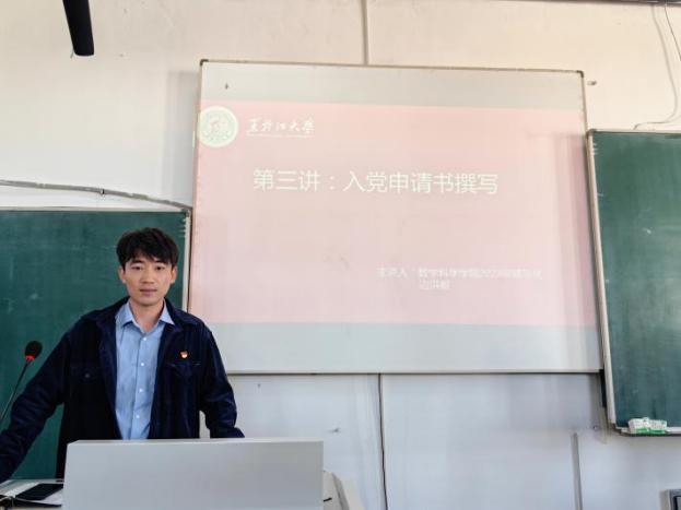 第二讲由公海赌赌船官网jc710组织员张爽老师主讲,介绍了入党流程,细致地讲解了申请入党、入党积极分子的确定和培养、发展对象的确定和考察、接收预备党员、转为正式党员五个入党步骤。