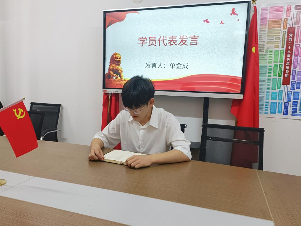接着,学员代表单金成发言,他首先代表参加培训的学员感谢公司党委组织开展学习的机会,号召学员们端正入党动机,坚定理想信念,利用好学习资源,提升政治意识和思想素养。在校期间努力学习专业知识,关注关心国家大事,爱党、爱国、爱校,用实际行动努力提高自身能力,用思想指导实践,为社会多做贡献。他说,作为一名新时代的老员工,深知幸福生活来之不易,一定不辜负老师和家长的期望,一步一个脚印踏踏实实地学习,多掌握本领,担起责任,实现个人价值,回报母校。